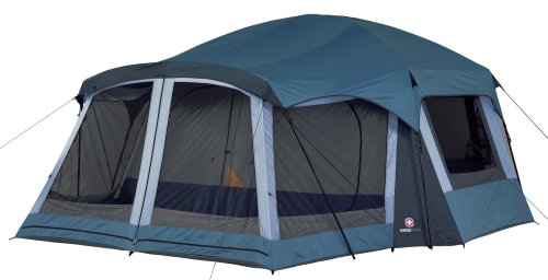 Swiss Gear Baregg Family Dome Tent sleeps up to 9 people comfortably in a 191 square foot area. Signature features begin with a shoe pocket to conveniently store muddy shoes, E-port for convenient access to electrical cords, Sewn-in security lock so you never misplace keys, Interior Rings keep flashlight or valuables secured and a Carry Duffel that converts to handy storage during camp-out. Customer care at 1-800-325-TENT (8368), or www.wenzelco.com