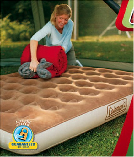 The Coleman Queen-Sized Quickbed is a great choice for camping, overnight guests, or anywhere you need an extra bed. Measuring 78" long by 60" wide when inflated (fitting standard queen-sized sheets), the Quickbed is made of heavy-duty, puncture-resistant PVC, with 48 coils inside and a soft suede top for extra comfort. The Quickbed is easy to inflate and deflate, thanks to Coleman's extra-wide Advanced Double Lock Valve. Like all Coleman inflatable products, this Quickbed features Coleman's Airtight System, guaranteed not to leak. And the built-in Wrap 'N' Roll storage system makes packing and storing quick and easy.